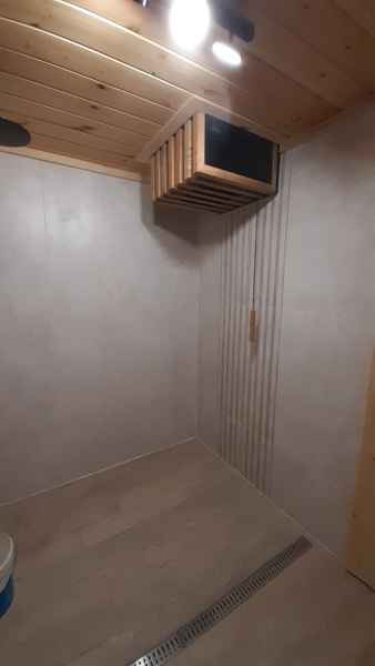- Для парной и моечной лучше всего подходит цементно-стружечная плита. Плиты укладываются на деревянную обрешетку, которую делают из брусков или досок, размером 50х50 мм. На обрешетке закрепляют листы ДВП. Затем листы необходимо обработать антисептиком для защиты от влаги, а также от гниения. После этого на них можно укладывать плитку из керамики или камня.