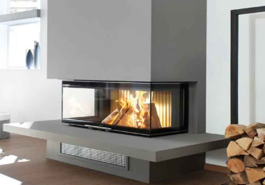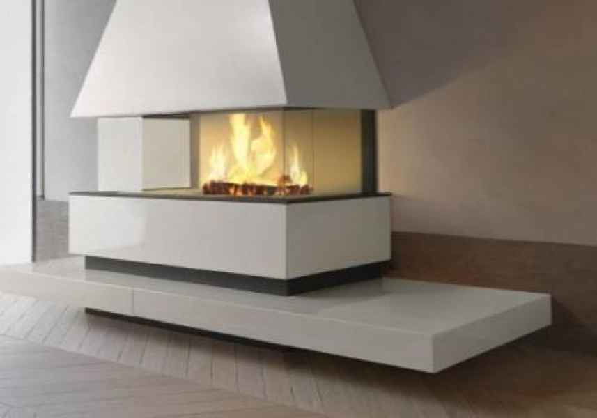 Камин в современном стиле с трехсторонней топкой и U-образным фальшстеклом. Такие камины используют в качестве основного источника тепла для обогрева помещений.