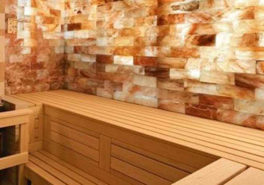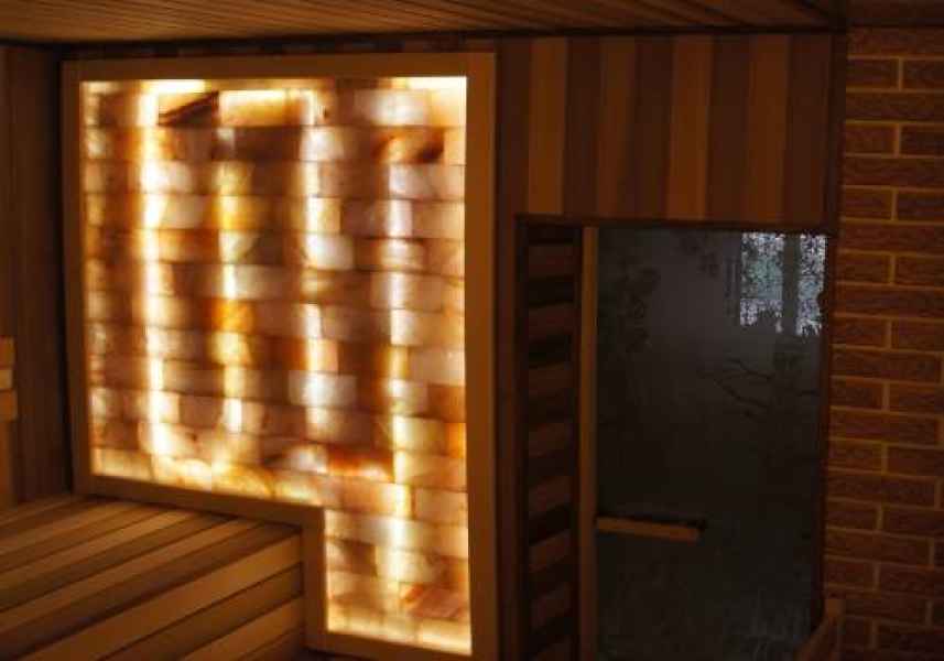 Отделка бани солевыми панно, панелью и кирпичиком внутри.