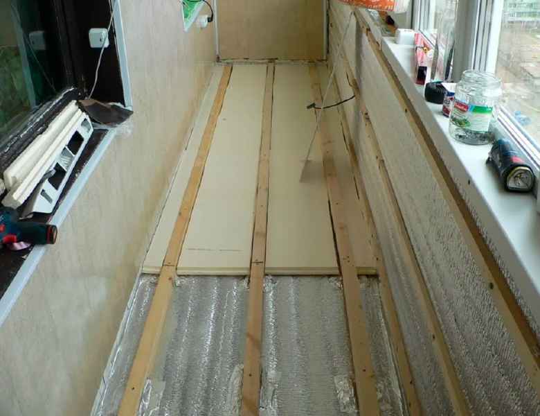 Укладывается поверх OSB. Листовой материал крепится к балкам; ламинат. Также устанавливается поверх OSB.